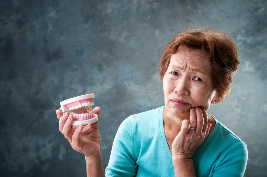 歯ぐきと顎の骨が痩せて口元がしぼみ、実年齢より老けて見られる傾向があります。